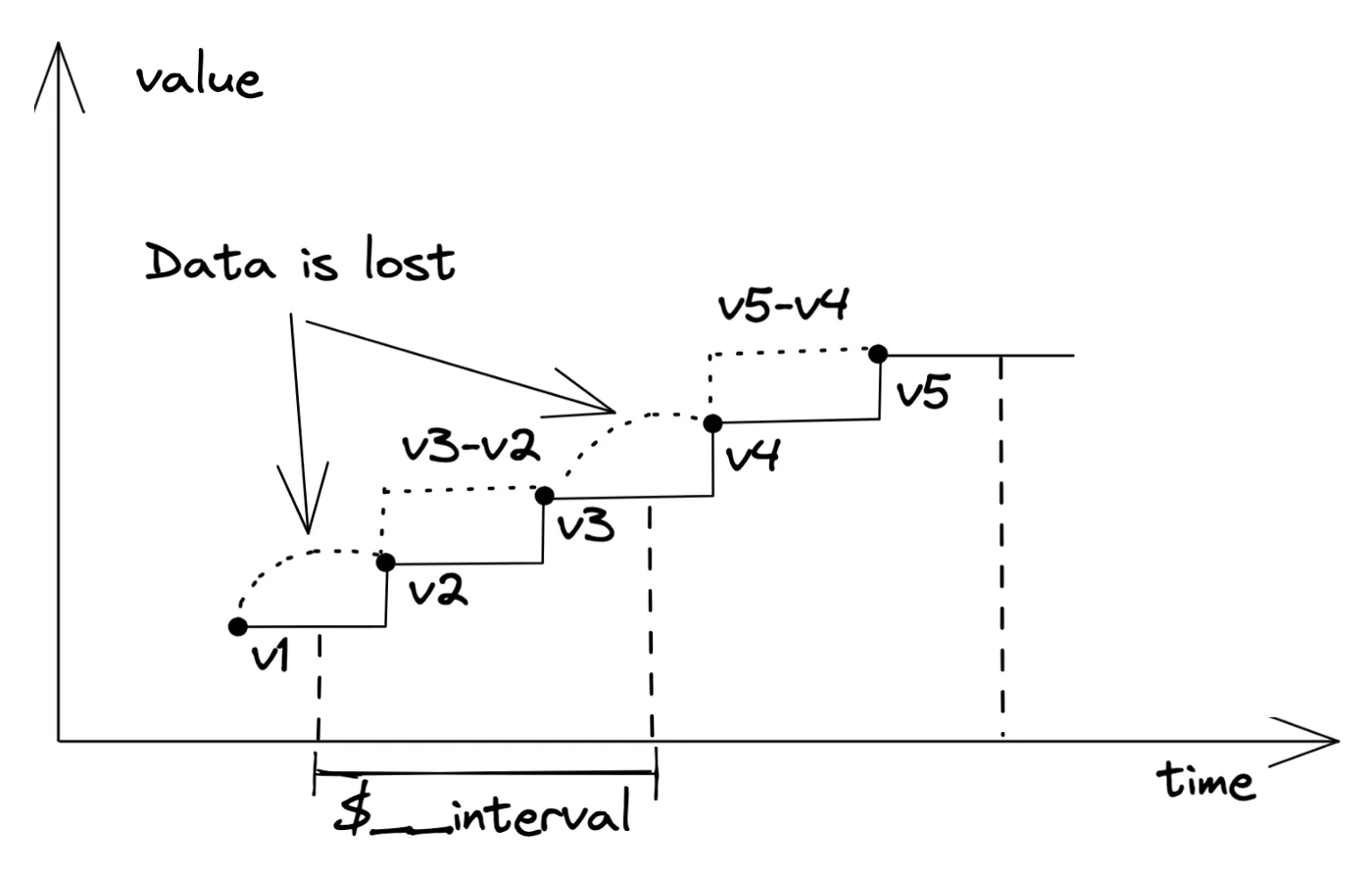 increase(metric[5m]) / 5m * (5m - scrape_interval)有致命性问题,也是 Prometheus 试图通过外推去弥补的:丢失区间中的差值